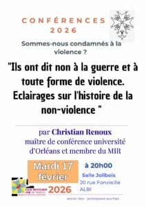 Eclairages sur l’histoire de la non violence » par Christian Renoux, maitre de conférences à l’université d’Orléans et membre du MIR (Mouvement international de la reconciliation , oeuvrant pour la paix et la résolution de conflits par la non violence. mardi 17 février 2026 20h salle Jolibois